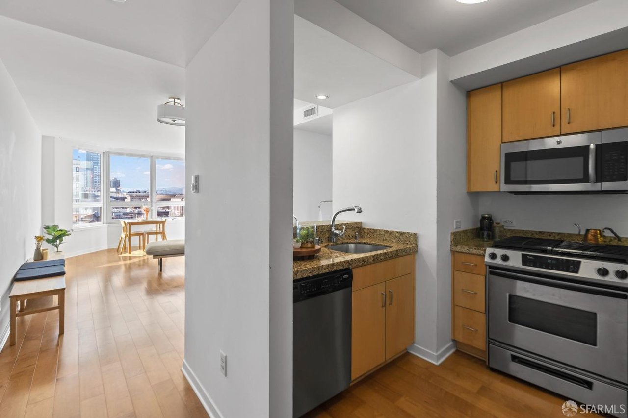 Rare high floor, move-in ready 1BD/1BA Symphony Towers condominium with mesmerizing unobstructed downtown views. This bright and airy unit has been thoughtfully updated with a modern floorplan, breakfast bar and an open living and dining space ideal for entertaining. Handsome hardwood floors throughout, in-unit washer/dryer and a spacious bathroom. Bedroom features views along with a walk-in closet featuring custom shelving. Kitchen highlights stainless steel appliances with a gas range, dishwasher, built-in microwave and refrigerator. Building offers secure entry and elevator, common rooftop deck, courtyard and bike storage. Independent 1-car garage parking completes this home. Conveniently located in the vibrant Performing Arts District and a stone's throw to the city's best restaurants, cafes, shops, markets, museums, nightlife with easy access to transportation and so much more.